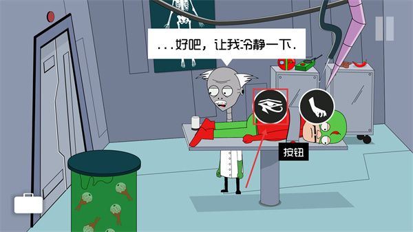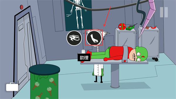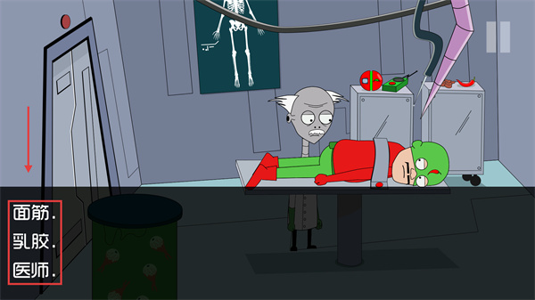 2、在場(chǎng)景中留意左側(cè)物品欄的【面筋】【乳膠】【醫(yī)師】類交互項(xiàng),可按箭頭提示探索門的交互方式。