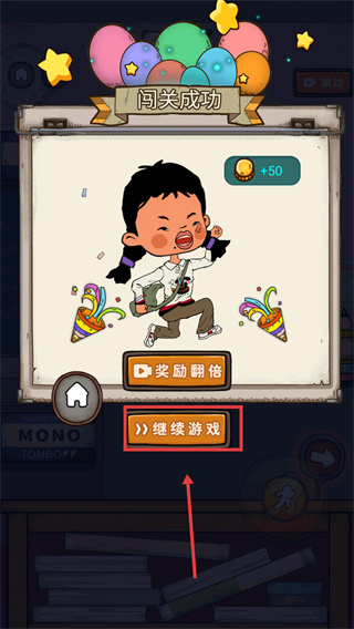 4、闖關(guān)成功后可獲得【+50】獎勵,點擊【繼續(xù)游戲】按鈕進入下一關(guān),也可選擇獎勵翻倍。